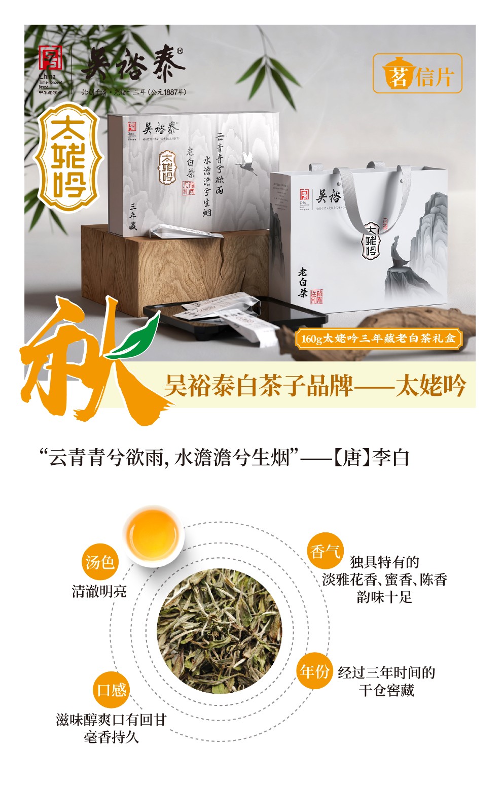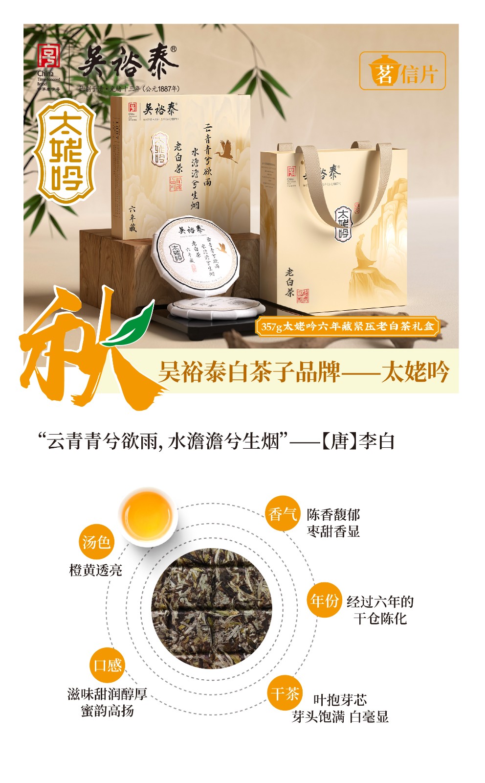 吴裕泰白茶子品牌——太姥吟灵感源自李白的名诗《梦游天姥吟留别》太姥致敬白茶的原产地福鼎太姥山传递好茶出自好山水的自然理念吟代表着对